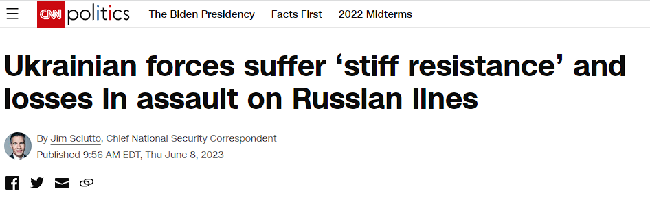 CNN пишет со ссылкой на американские источники, что украинская армия в общем наступлении на востоке Украины добилась определенных успехов, но понесла значительные потери, в том числе и в бронетехнике, при попытке штурма укрепленных позиций россиян, поскольку встретила более ожесточенное, чем ожидалось, сопротивление.