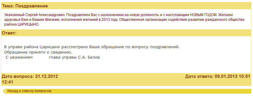 "Обращение принято к сведению"... При том, что поздравила некая местная организация, это намек на то, что кто поздравил - молодец. А кто нет... ну что ж, сами виноваты.