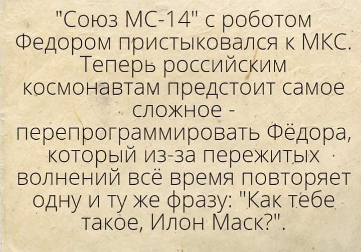 Мы с котом Бубликом глубоко возмущены действиями космонавта Алексея Овчинина. Федор - первый в мире рогозинподобный робот, прилетевший на МКС. Он пережил огромный стресс, когда стыковка со станцией с первого раза не удалась. У него окислились аккумуляторы, расстроился гироскоп, а внутренние проводочки стали хрупкими. И вот он наконец-то добрался до МКС. И какой же прием он там получает? Сначала Овчинин тилибомкал его кнопку и очевидно - делал это без уважения. Потом он ковырял в остатках достоинства Федора гаечным ключом. После этого он и вовсе собрался долбануть несчастного робота молотком, и тот пришел в такой ужас, что даже включился и пробормотал: "Себе по башке молотком тресни, умник".