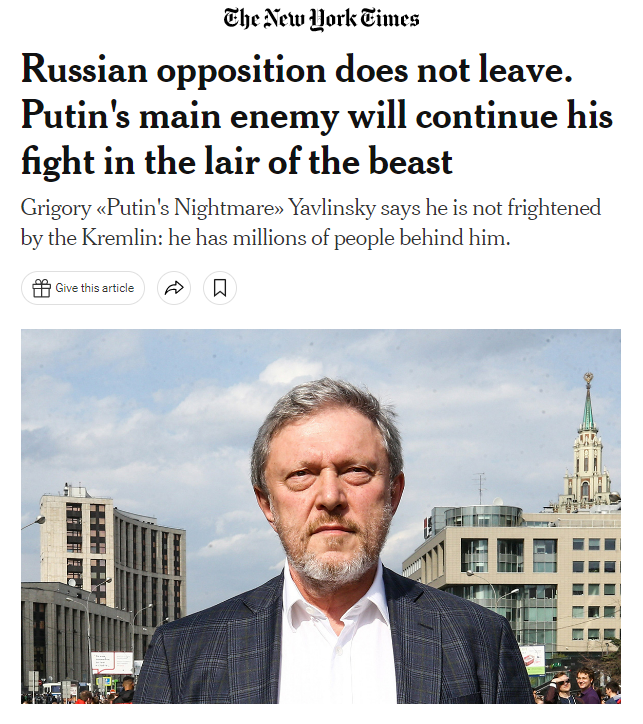 Вы бы ещё сказали "Навальный не политик, посмотрите интервью Путина". Как раз Навальный политик, он занимается активной политической деятельностью, даже из тюрьмы, а вот тактика Явлинского это забиться в тёмный глухой угол и не отсвечивать, а там глядишь всё само рассосётся. Явлинский, в своё время будучи лидером главной оппозиционной партии просрал все полимеры, растерял всю популярность и не делал вообще ничего, разве что изредка наезжал на Навального и призывал сидеть тихо и не рыпаться, что играет на руку Путину.