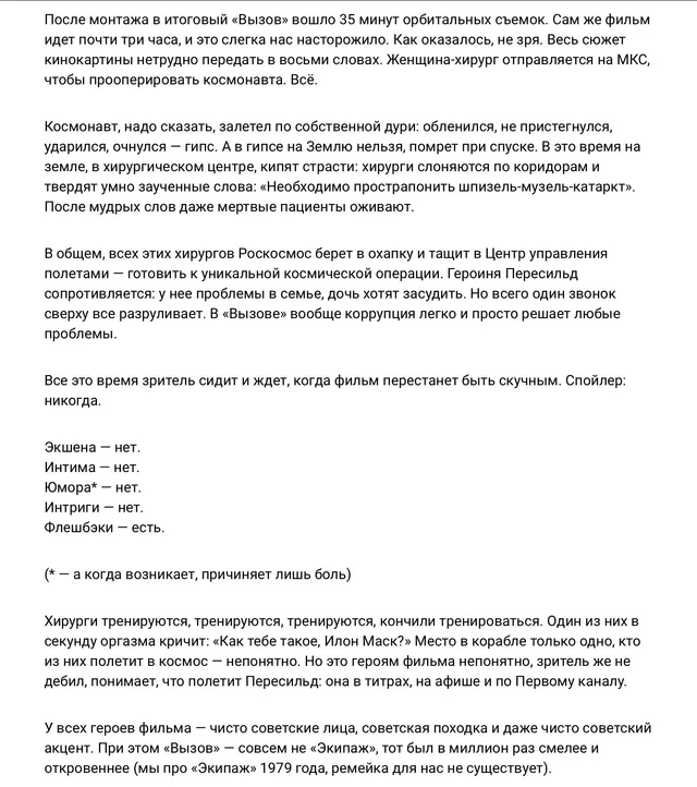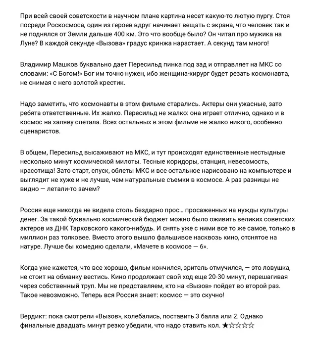 Если честно я когда узнал о съёмках этого фильма захотел посмотреть что получится. Ведь "снимали в реальном космосе" работает только если сам продукт качественный, мне действительно было интересно. Но это всё до войны, теперь же российское кино (которое снималось или выходит во время войны) для меня не существует, все российские платформы успешно удалены. Даже если это кино которому суждено стать культовым, я пожалуй пас. Единственное чем это кино оказалось полезным, это только тем что я узнал о присутствии Урганта на премьерном показе. Кажется Иван становится мудаком. Печально всё это.