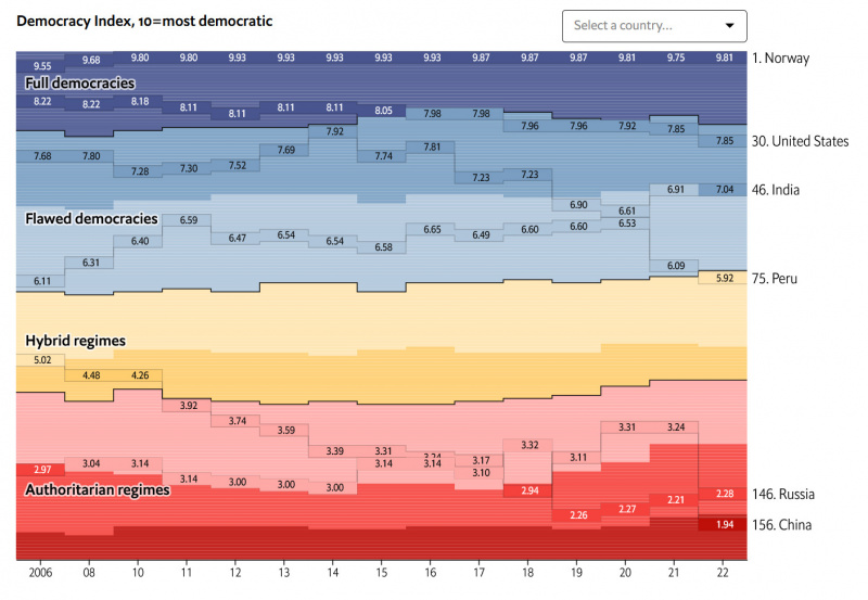 Статья в The Economist о наиболее и наименее демократичных странах в мире в 2022 году - "The world’s most, and least, democratic countries in 2022".