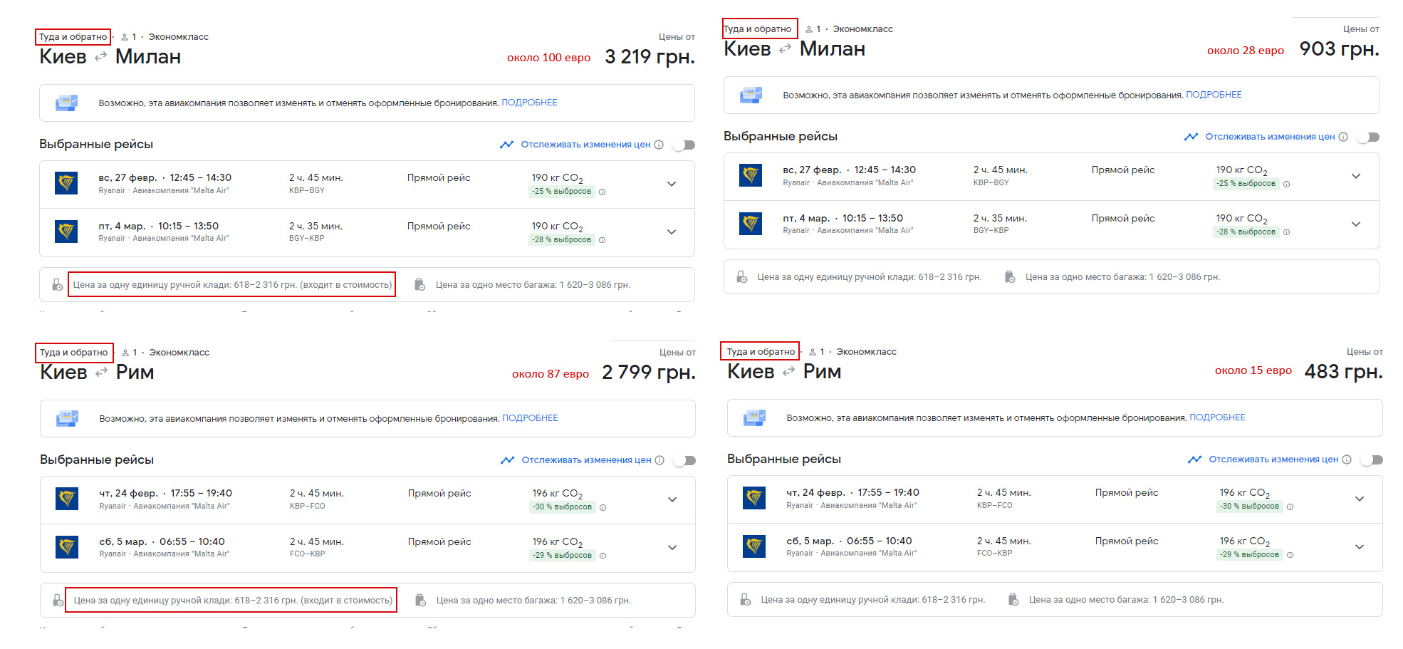 Сейчас посмотрел: Киев - Милан на 16 февраля с багажом: 158 евро в одну сторону.