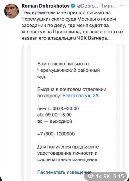одно другому не мешает, тут проскакивала информация о вызове в этот понедельник в суд по иску о клевете на Пригожина, что ему якобы принадлежит ЧВК вагнер