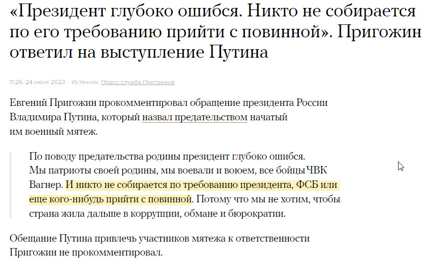 кстати потом Пу в своем выступлении и не назвал Пригожина по имени. Опасается на пятнашечку залететь 😄