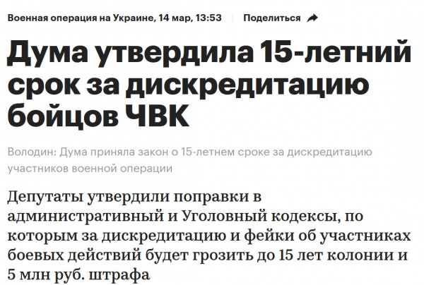 Я, кстати, напоминаю всем средствам массовой информации, особенно федеральным, что за любую дискредитацию и фейки в отношении бойцов ЧВК "Вагнер" вам грозит 15-летний срок и 5 млн штрафа. Не забывайте об этом. Законы РФ обязательны для всех!