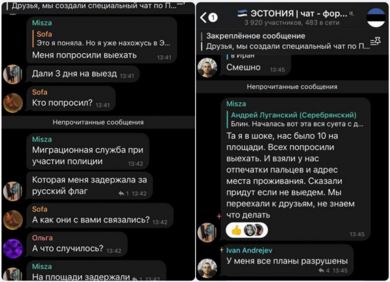 Десяток рашистских придурков решили помахать российскими флагами на центральной площади в Таллине - поддержать, так сказать, гуманитарную спецоперацию Вовы Путина по демистификации Украины. Придурков сначала задержали, а потом потребовали покинуть страну в течение трех дней. Теперь придурки сидят в чате и плачутся. А чего плакаться-то? Быстро взяли чемоданы и в Мордор, Путина поддерживать. Молодцы, эстонцы, четко отреагировали.