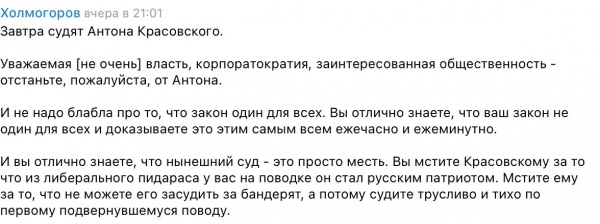 Оказывается, Красовского в РФ за что-то будут судить. По крайней мере, так написал публицист Холмогоров, который нашел для друга слова поддержки (я это увидел в ТГ "На Zzzzzападном фронте без перемен")