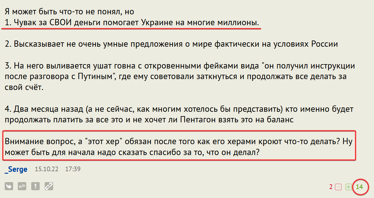 То есть, Семигин неизменно говорит о "вооруженных силах" с придыханием, и с гордостью - о своей службе в них. Даже под веществами, человек употребляет привычную ему лексику. Никогда Семигин не писал "ВС РФ". Вообще, чем больше читаю в каком тоне Семигин пишет о российских военнослужащих, тем больше ценю тролля, который именно ему догадался приписать: "пинками загонять солдат ВС РФ на поле боя". Возможно, что посетители нашего сайта просто решили поддержать троллинг?