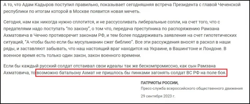 Ну да, переборщил слегка Семигин в стремлении вылизать зад Кадырову, перестарался. Видимо, вторая бутылка коньяка была лишняя, потому что фраза про батальон Ахмат, который, дескать, пинками загоняет трусливых русских солдат на поле боя, она не могла не пройти незамеченной среди z-сообщества, где немедленно вскипела ярость благородная среди самых главных zалуп-патриотов.