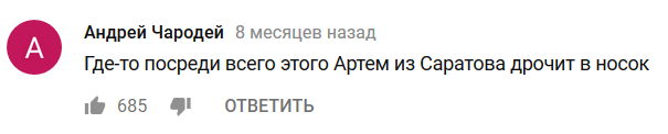 а так да!!!! обалденная демонстрация того и на артема и на его носок и вообще на весь саратов с землей и солнечной системой вместе всем покласть этак болт под ключ размером на 50.