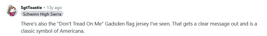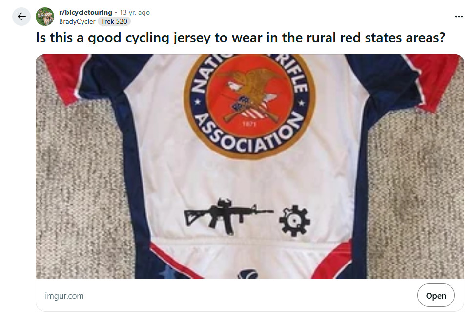 Такие флаги в США велосипедисты себе вполне вешают, и никакого неуважения к флагу при этом нет. Говорят, некоторые вешают, чтобы их не харассили реднеки и МАГОвцы; последние считают, что на дороге должны быть только огромные пикапы и SUV, а на велосипедах ездят леваки и фанаты социалистической Eвропы. Могут прижать, обдать дизельным дымом, подрезать, или просто проорать "Get off the foooocking road!" (со мной такое случалось много раз). А если, мол, флаг, значит велосопедист -- тоже патриот, просто немного заблудший, и его не трогают. Еще советуют надевать характерные футболки, типа NRA или John Deere.