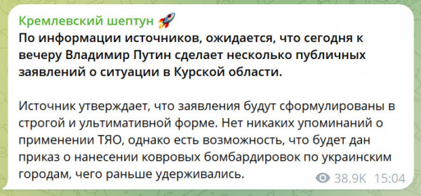 Компетентные шептуны сообщают, что сегодня Путин ЖОСКО выскажется, ЖОСКО! И УЛЬТИМАТИВНО! Возможно, даже отдаст приказ обстреливать украинские города, чего раньше никогда не делали.