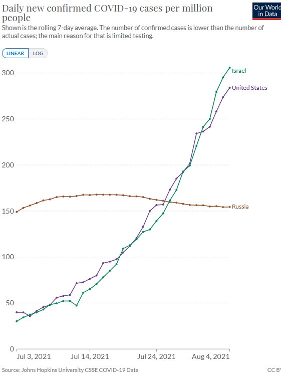 Израильский эксперимент показывает, что поголовная вакцинация мало что даёт. Важно вакцинироваться нам, пожилым людям и хроническим больным. А если кто думает, что именно отказ отдельных нехороших людей не даёт открыть границы и снять другие обременительные ограничения, то гляньте на успехи Израиля после вакцинации: ограничения на выезд усилены, введена уголовная ответственность за посещение многих стран; правительство обсуждает, когда вводить следующий локдаун -в сентябре, или сразу в августе.