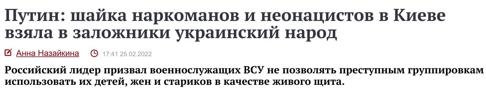 "Нас вынудили напасть на Украину. Мы не начинаем войны, мы их заканчиваем. Это, кстати, не война, а спецоперация. Мы бомбим только военные объекты. При этом на Украину мы не нападали. И роддом мы не бомбили. И драмтеатр мы не бомбили. И Азовсталь мы не штурмуем, мы же людей бережем. Буча — это тоже не мы, кстати. И вообще мы ушли из Киевской и Черниговской области в качестве жеста доброй воли. Боинг, кстати, тоже не мы сбили. И военных наших в ДНР и ЛНР не было тогда, это они сами себя защитили. И все 8 лет сами себя защищали. Корабль наш, кстати, плавучесть сохранял, пока не утонул, но утонул он сам и в спецоперации не участвовал. И погиб там один человек, а все остальные без вести пропали, то есть видимо уплыли куда-то сами, наверное. И вообще наши солдаты не гибнут почти, пропадают, да, но не гибнут. И срочников там нет, ну то есть нет, но нет. Жителей мы, кстати, не убиваем, не насилуем, не грабим, мы их освобождаем. От нацистов. А что они евреи, ну так и Гитлер был евреем. А евреи — они вообще главные нацисты, вы чего, не знали что ли. Учите историю. А санкции — ну их бы и так ввели, мы же встаем с колен, а все нас боятся. А то, что их ввели так много — так это окно возможностей. И все это наш президент придумал, потому что у него выбора не было, надо вокруг него сплотиться, это же наш президент, выбранный на выборах, которых нет, но они есть на самом деле, потому что кому не нравится — те пятая колонна и ее надо выплюнуть как мошку на асфальт.