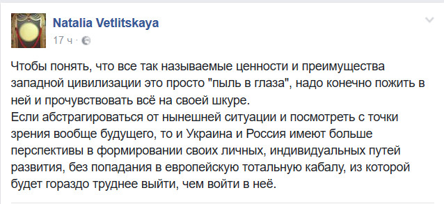 Ветлицкая всегда была такая, обращать на певичку очень легкого жанра и еще более легкого поведения? недвига ей перепала от олигарха Керимова, видимо он ее снял с пожизненного довольствия и у нее крыша съезжает, впрочем давно уже съезжает. Раньше ненавидела всех россиян, которые сюда приезжали, сейчас уже и Испанию не навидит. Да ну ее эту невменяшку-фантазерку. Почитала ее жж один раз-там йога головного мозга к тому же, сектанткой стала. В игнор ее.