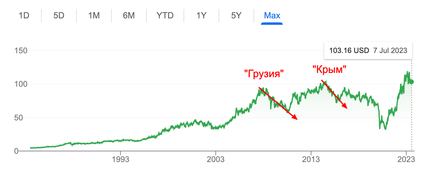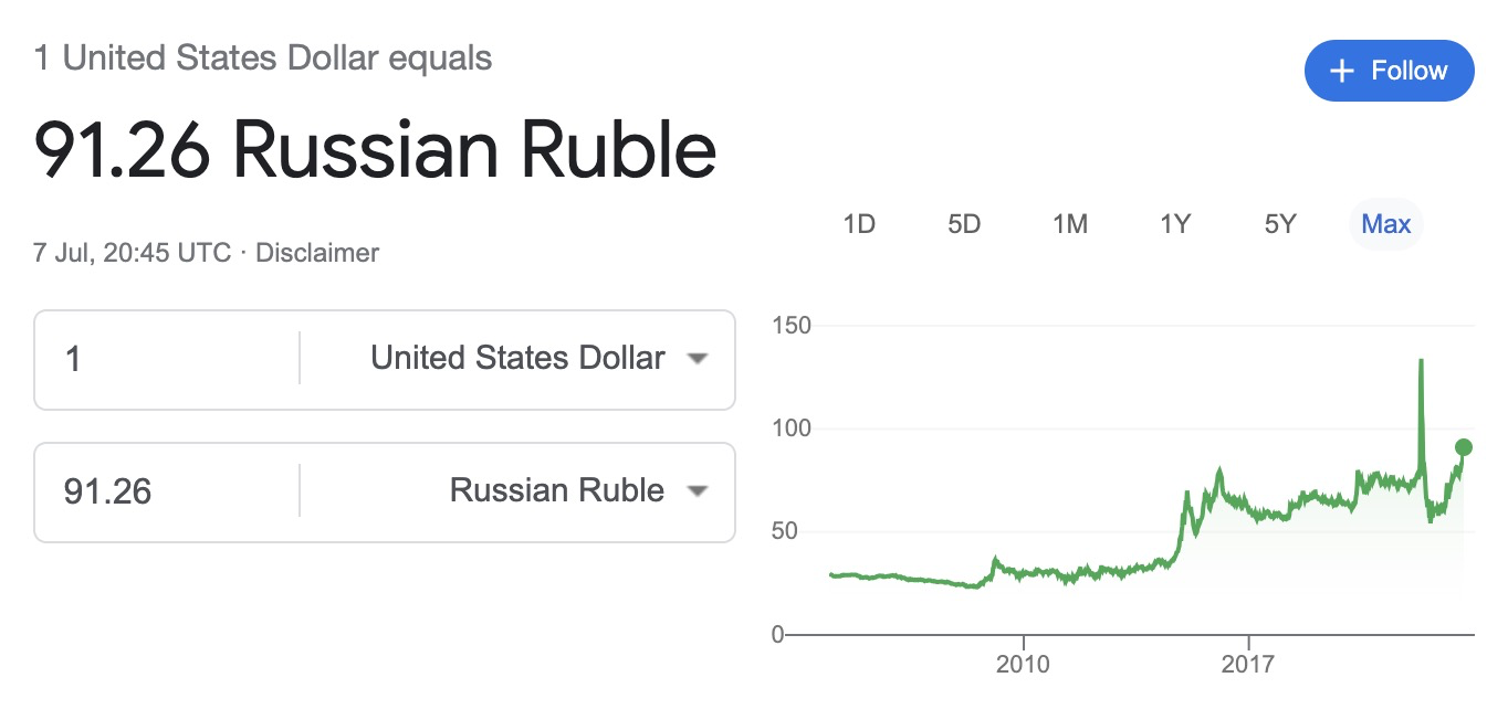 С начала года на Московской бирже доллар и евро подорожали почти на 30% и в четверг, 6 июля, достигали отметок выше 93 и 102 рублей соответственно. В пятницу курсы чуть отступили от пиков: на 13:24 мск американская валюта стоит 91,7 рубля, европейская — 99,81 рубля.