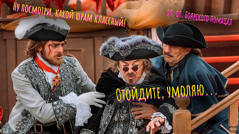 Потом выясняется, что женщина с винирами это дочь Ягужинской. У Боярского опять истерика, он орет «Анастасия, звезда моя», на фоне играет Ланфрен-ланфра. Приезжают гардемарины и музыка сменяется на саундтрек «Пиратов карибского моря».