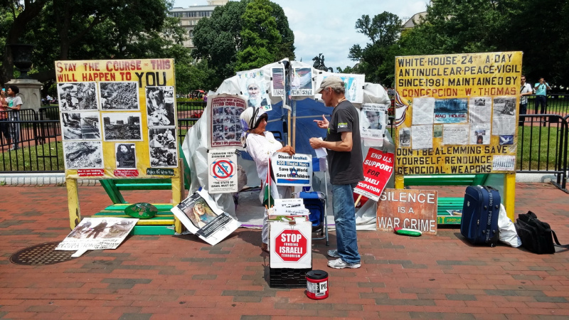 Я потом был несколько раз в Вашингтоне у Белого дома и видел там всяких "голодающих", протестующих и так далее, там такого добра - как грязи. Вот, например, тетка, протестующая против политики Израиля, нагло препятствующей истреблению всех евреев благородными палестинцами. Протестует она, конечно, исключительно по зову души, а вовсе не за подачки от "Хамаса".