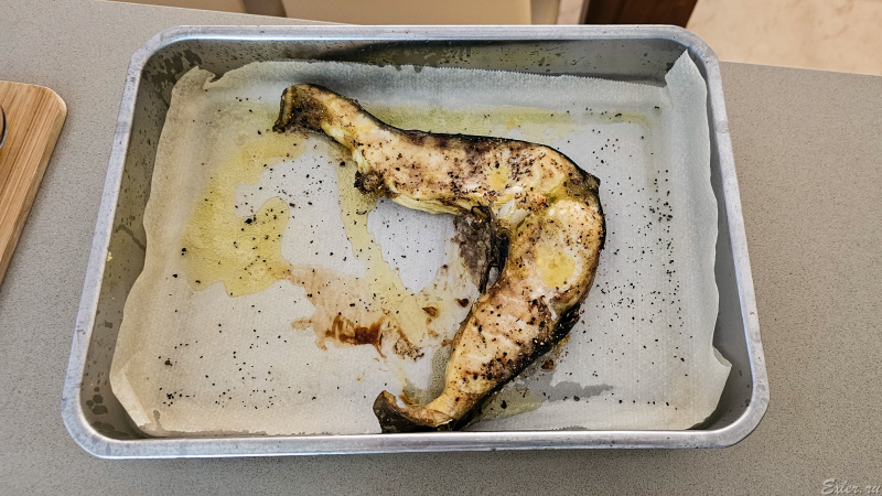 Сначала сделал в духовке - 30 минут на 200 градусов. Получилось отлично: рыба нежная, сочная. Предыдущие стейки в духовке готовить было бесполезно - становились сухие. А тут - то что надо.