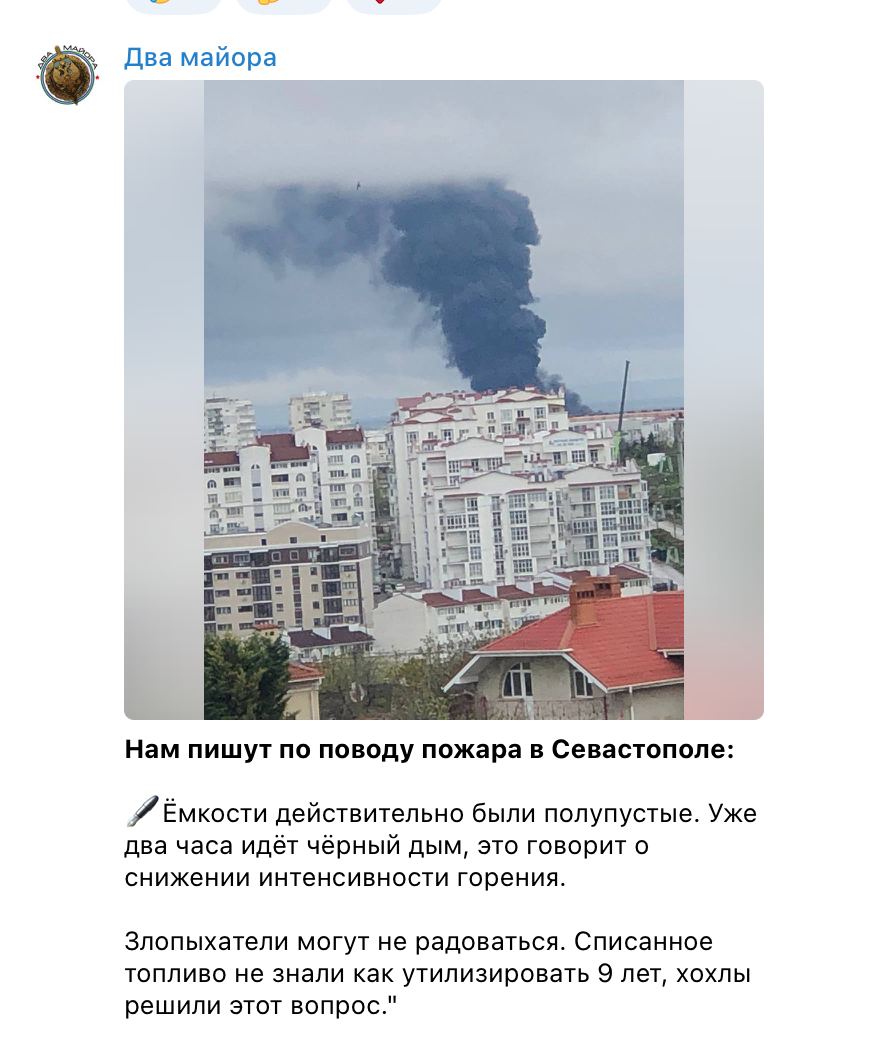 «Об атаке беспилотника ВСУ на Севастополь и возгорании нефтебазы в Казачьей бухте. Времени „на медленные танцы“ у нас больше нет. Произошедшее требует ответного жесткого решения и действий. Все нефтеналивные хранилища Одессы должны быть уничтожены. Стратегическое решение о нейтрализации Одессы как военной базы Украины должно быть принято».