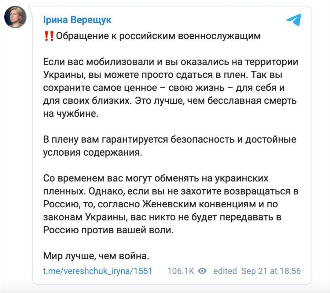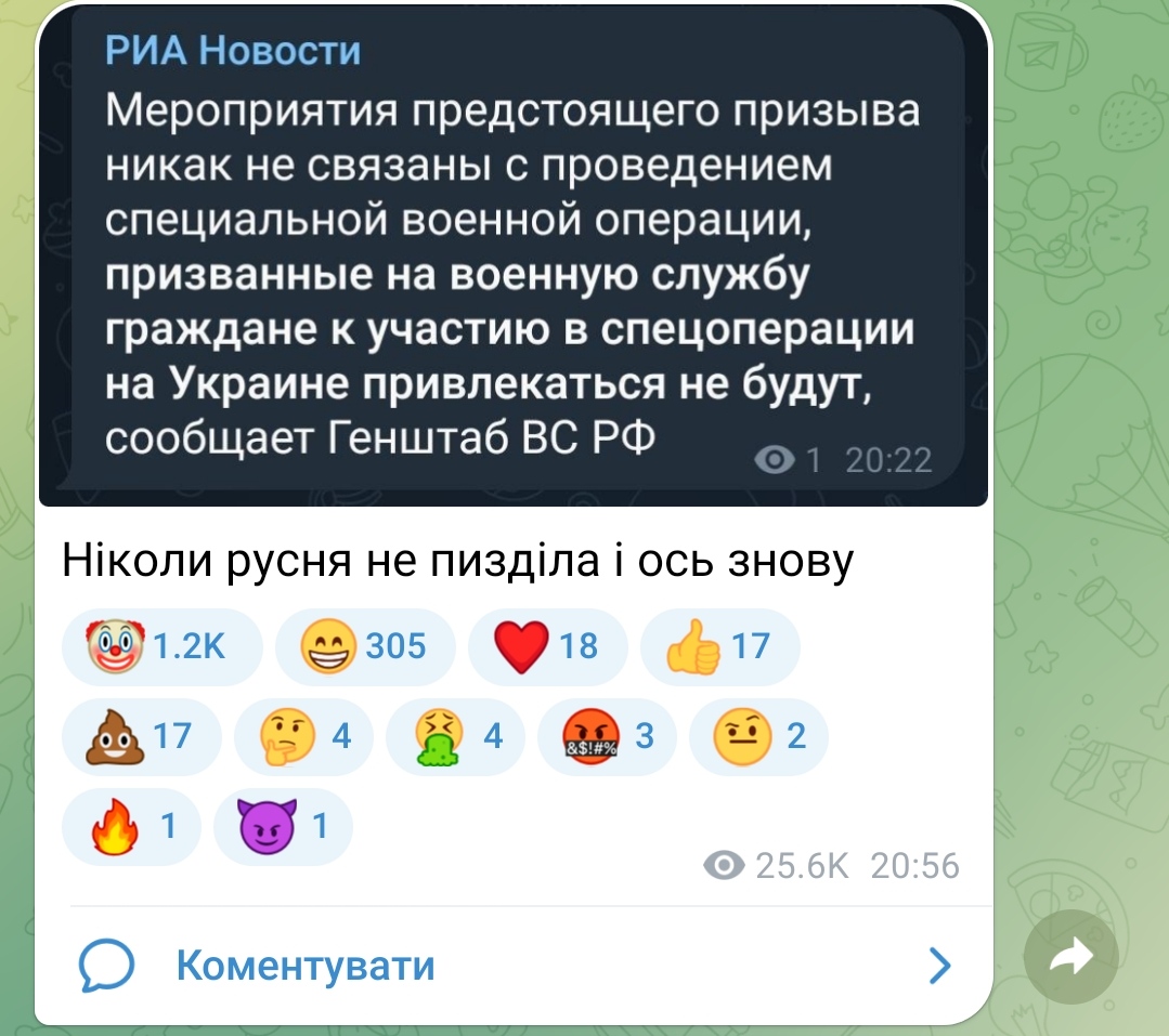 Маргарита Симоньян, за несколько часов до этого намекавшая на вероятное применение Россией ядерного оружия, заявила, что для нее «радость от спасения своих» важнее, чем «удовлетворение от воздействия врагу».