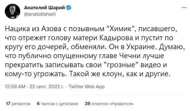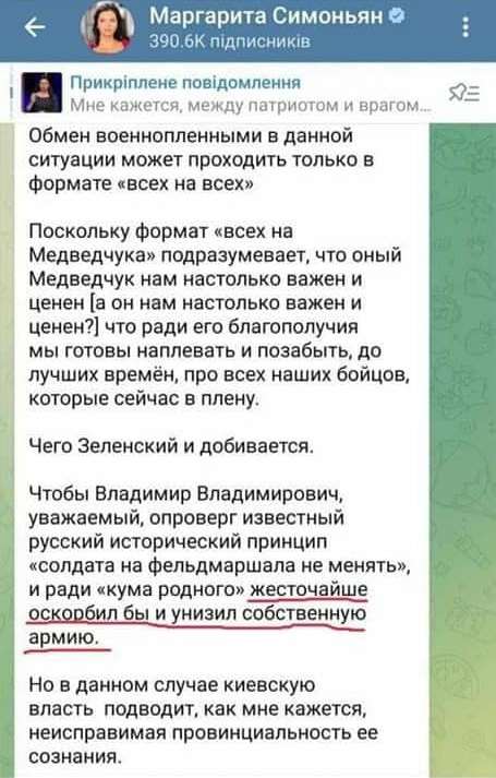 Вчера Путин обменял 215 командиров и бойцов "Азова" на своего кума Медведчука и 55 российских военных, показав таким образом, каких именно своих и как он не бросает.