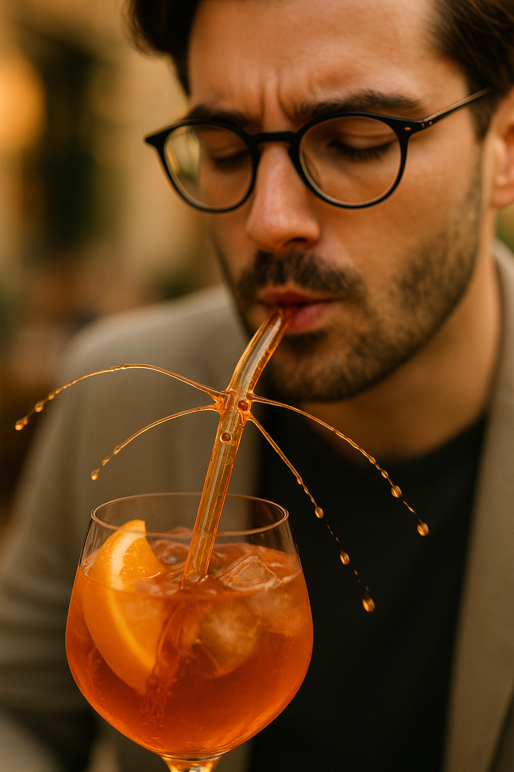 Пошел проверил - на обычной коктейльной пластиковой трубочке 😄 Проколол ножницами три отверстия рядом посередине. Оказалось, тогда жидкость вообще сложно втянуть - вместо нее слишком много воздуха засасывается. Но что за вопросы к дизайнеру? Оставьте скушную физику технарям! Впрочем, антиполезность трубочки возросла - значит основная цель все же достигнута.