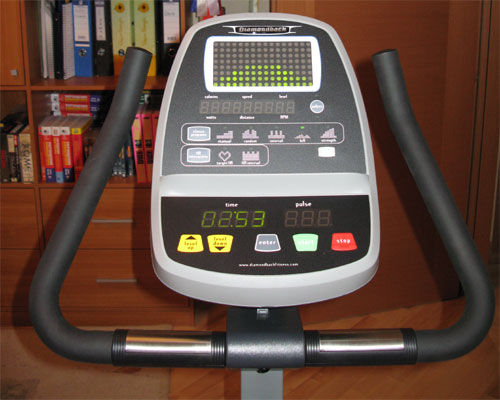 Долго рассматривал самые разнообразные варианты, а потом у знакомого увидел американский тренажер Diamondback, который мне не попадался в магазинах. Правда, у знакомого он был в "лежачем" варианте (нет нагрузки на позвоночник, что ценно), а мне лежачий не подходил, так как на нем невозможно одновременно с тренировкой смотреть телевизор. В результате нашел сидячий вариант того же производителя (860Ub) - вот как это все выглядит: