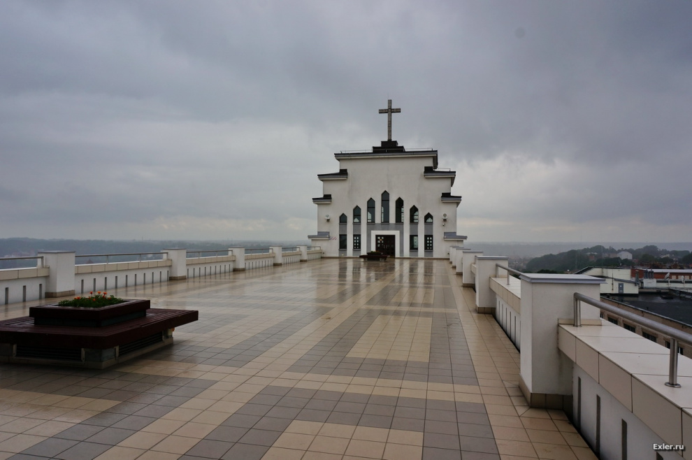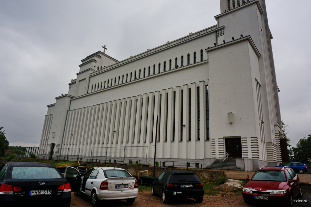 А вот это - невероятно оригинальное здание. Называется костел Воскресения. (Пардон, что он снаружи так криво снят: лупил дождь, вокруг костела была дикая грязюка, отойти не было никакой возможности. Да и желания.)