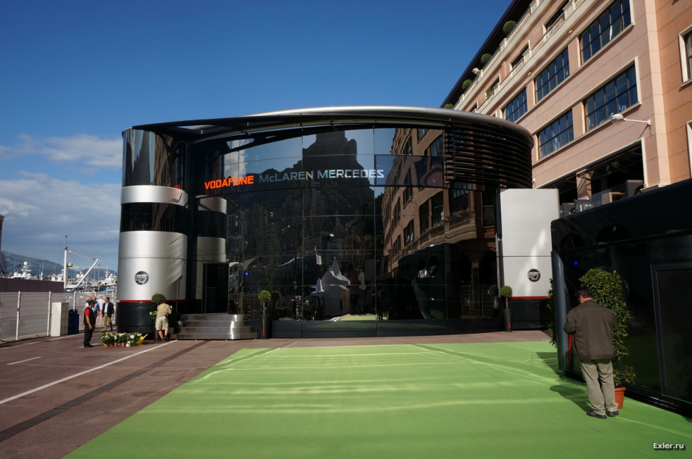 Заходим на территорию паддока. (Насколько я помню, паддок - это открытая площадка с навесом рядом с обычной конюшней, а в "Формуле" паддоком называют всю закрытую территорию, на которой находятся рабочие зоны команд, участвующих в "Формуле".)