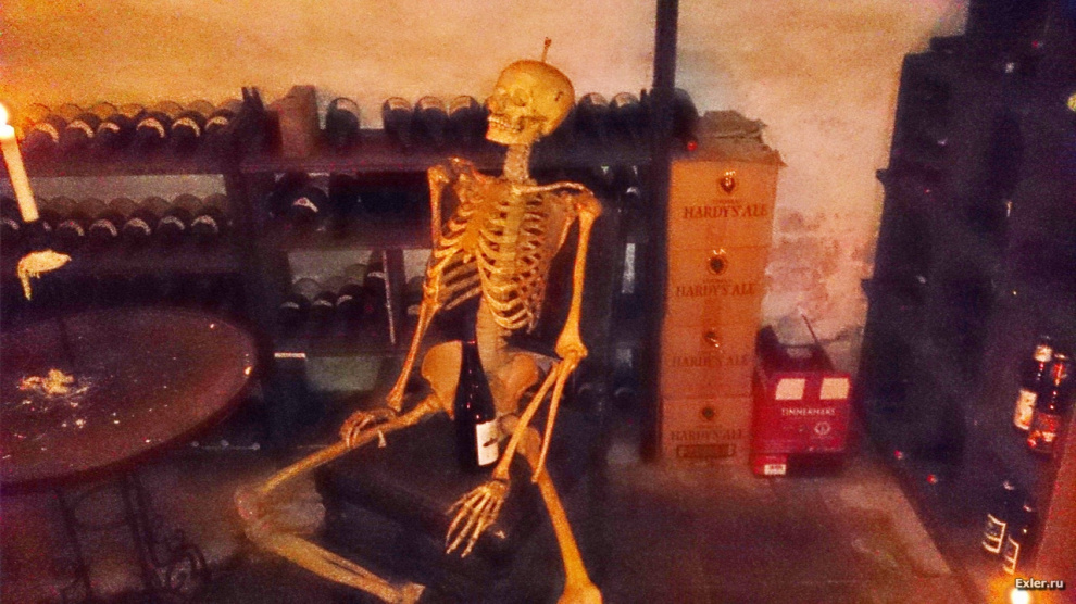 Вечером был ужин в ресторане, потом мы спустились посмотреть на местный винный погреб. Там обнаружился сильно загулявший постоялец отеля, который однако сохранил присутствие духа - вон как он улыбается.