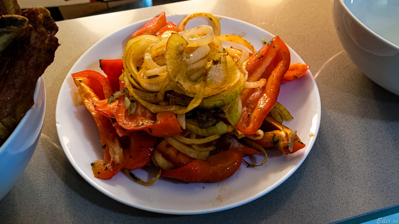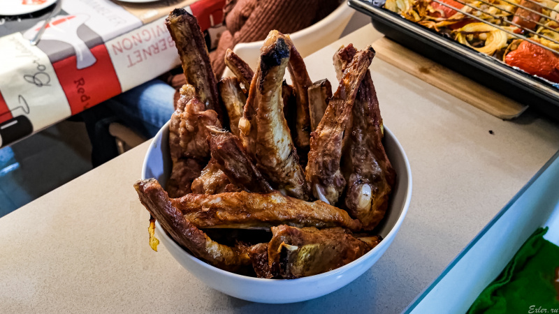Сверху на овощи поставили решетку с крупными свиными ребрышками, которые сутки мариновались в репчатом луке, специях и оливковом масле.