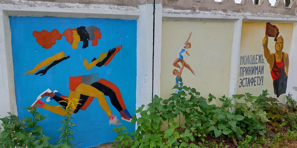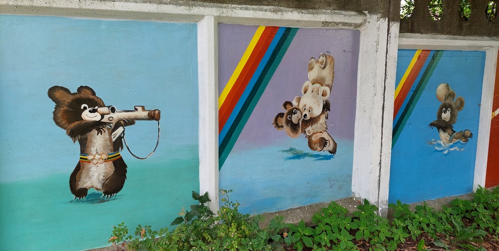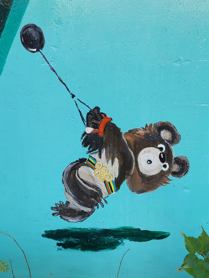 В Дубне забор стадиона разукрасили мишкой в разных видах спорта. Да и не только. Стилизованные под разные времена открытки тоже есть.