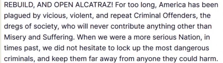 ВОССТАНОВИТЕ И ОТКРОЙТЕ АЛКАТРАЗ! Слишком долго Америка страдает от жестоких, насильственных и рецидивирующих преступников, отбросов общества, которые никогда не принесут ничего, кроме страданий и боли. Когда мы были более серьезной нацией, в прошлом мы не колебались, заключая в тюрьму самых опасных преступников и держа их подальше от тех, кому они могли навредить. Так и должно быть. Мы больше не будем терпеть этих серийных преступников, которые сеют грязь, кровопролитие и хаос на наших улицах. Поэтому сегодня я поручаю Бюро тюрем, Министерству юстиции, ФБР и Министерству внутренней безопасности вновь открыть значительно расширенную и перестроенную тюрьму АЛКАТРАЗ для содержания самых жестоких и опасных преступников Америки.