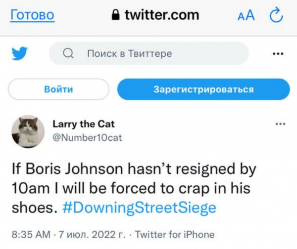Сегодня утром в официальном твиттере кота Ларри, главного мышелова правительства, прозвучал ультиматум: если Джонсон не покинет свой пост до 10 утра, Ларри нагадит ему в туфли.