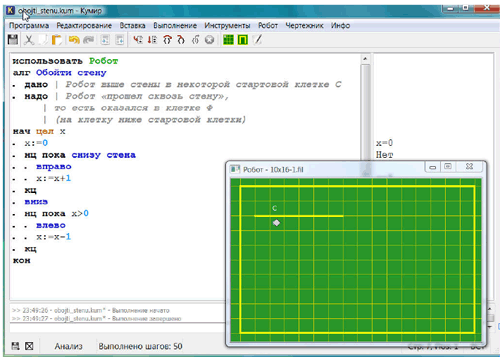 Причем, в учебнике еще часть алгоритмов была про управление неким виртуальным роботом, живущим на клетчатом поле и умевшим раскрашивать клеточки. Опять же, наверно это просто для иллюстрации идей - подумал сперва я. Однако оказалось, что при запуске программ на этом языке действительно запускается виртуальная среда с этим бегающим по экрану "роботом" 😉 Чудеса советской техники, короче.