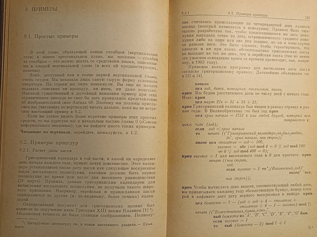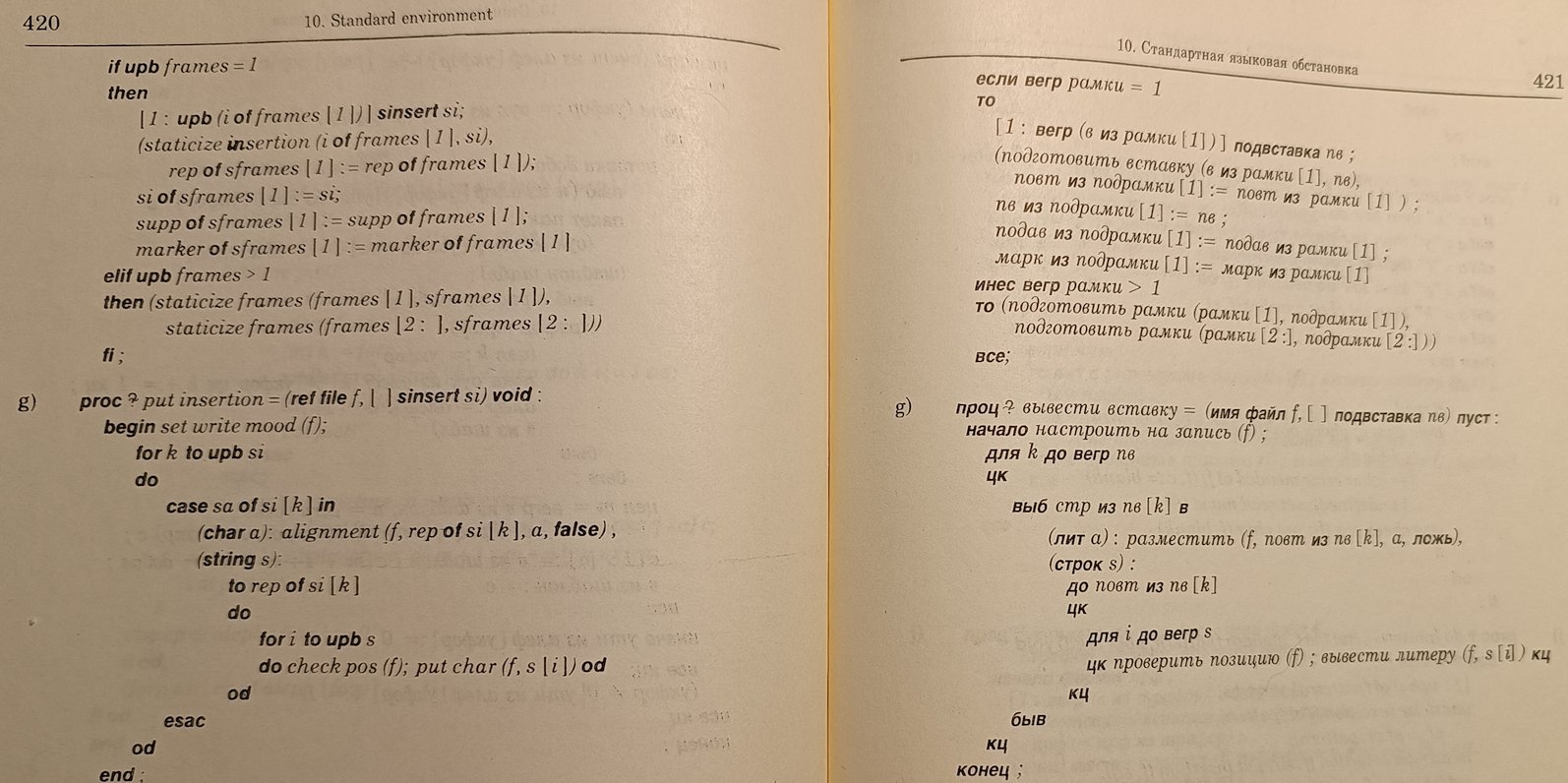 По-моему, в Алгол-68 был и цк в русской версии. В анлийской все операторные скобки были типа if - fi, case - esac, do - od, а в русской если - илсе, цк - кц. Могу в воскресенье сфоткать страницы. Прекрасная книжка по Алголу-68 была. Её можно было читать по горизонтали и по вертикали. Так и писалось там, "читающие по вертикали, перейдите к главе такой-то". А какие там программы в приложении! Расчёт даты пасхи 😄