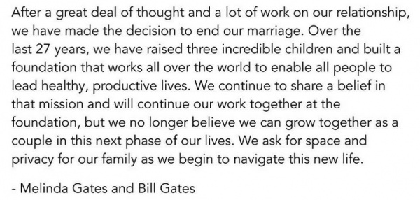 Супружеская чета Билла и Мелинды Гейтс обнародовала совместное заявление, в котором супруги сообщили о предстоящем разводе после 27 лет брака.