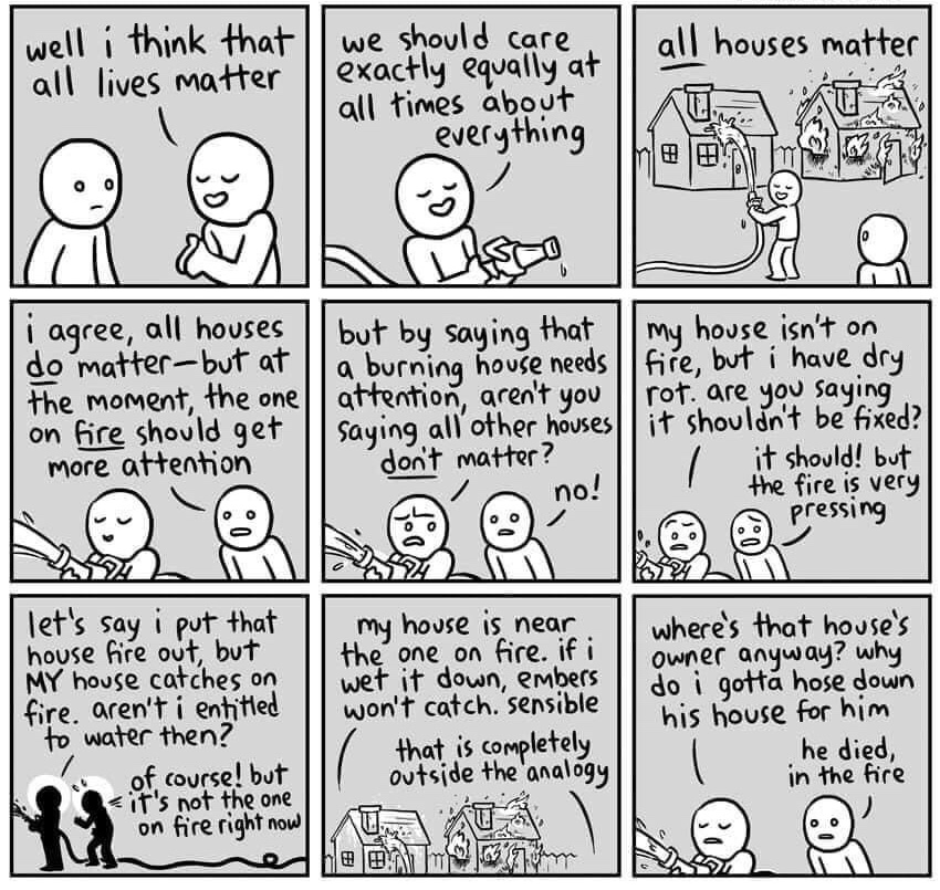 Вам непонятно почему на All Lives Matter идет бурная реакция и пена изо рта? Я объяснил. Более того этот пример не я придумал. Это пример придумал черный знакомый, которого я попросил объяснить простым языком что значит BLM для него.