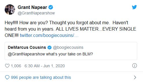Радиоведущий спортивного шоу Грант Напеар был уволен за твит с сообщением, что "ВСЕ жизни важны", проклятый расист. Пруфлинк.