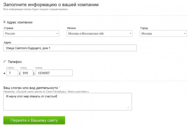 Работает это очень просто. Сначала регистрируетесь, задаете название фирмы, слоган, адрес и телефон.