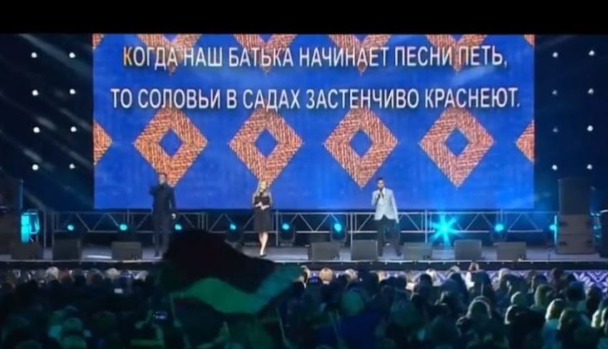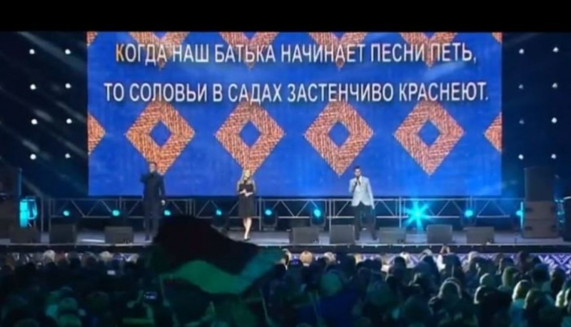 Картинка с позавчерашнего концерта в Минске, на котором продажные певцы ротом за государственные деньги прославляли упыря-убийцу, узурпировавшего власть в Беларуси.