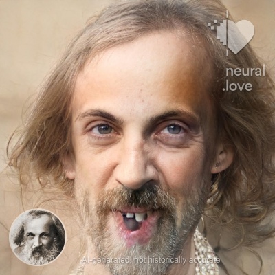 У него так борода kак-то не так выглядет, и нейросеть решила, что мендееву надо сломать передний зуб. Еще ему жемчужное или какое ожерелье пририсовала