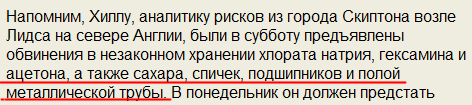 Не забудьте также уничтожить марганцовку и зеленку. А главное - йод и нашатырный спирт (куда уж там хлоратам). Вылейте из аккумулятора кислоту от греха. Выкиньте из аптечки нитроглицерин. Кроме сахара, не держите дома алюминиевой посуды. А уж если у вас на даче завалялась аммиачная селитра - сразу являйтесь с повинной. Добровольное признание смягчает. 😄