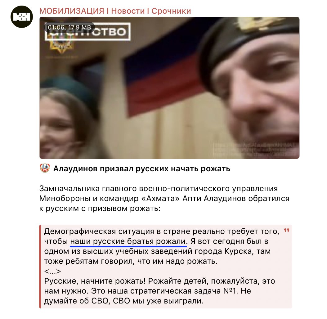 Апти Аронович - он, конечно, милый, милый. СВО, грит, выиграли уже - кто бы что ни говорил. Ну дали разрешение лупить ракетами по Раисси - ну так сколько у них тех ракет-то, госсопади! А русским бабам Апти Аронович лично приказал рожать. Важная, грит, стратегическая задача. Не для СВО, нет. СВО-то выиграли. Но стратегически - рожать, ать-два.