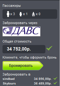 Ради интереса зашел на сервис Skyskanner, которым обычно пользуюсь для подбора билетов, и посмотрел, что предлагается на то же число. Ничего интересного там не увидел - "Трансаэро" дороже в 2 раза, "Аэрофлот" в 3 раза, - однако вдруг обратил внимание на цену, которую дают на моего перевозчика. А цена при всех равных условиях (тот же рейс, то же число, то же количество людей), получилась вот такая интересная.