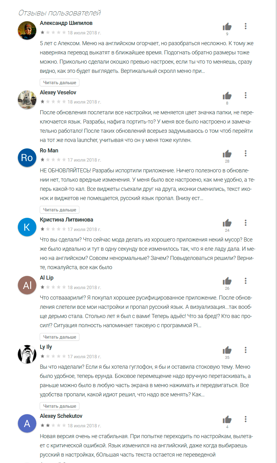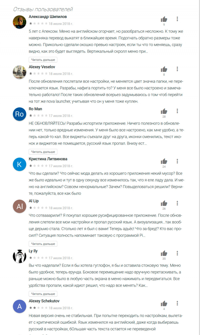 Популярная оболочка Apex обновилась. Лучше бы они этого не делали, пользователе просто в бешенстве: пропали все настройки, иконки налезают друг на друга, пропал русский язык, пользоваться стало просто невозможно. Комменты на Google Play - очень показательны. Особенно горячо "радуются" те пользователи, которые приобретали Pro версию. Я, кстати, приобретал. Но, слава бога, сейчас использую Nova Launcher, она мне нравится больше, чем Apex.