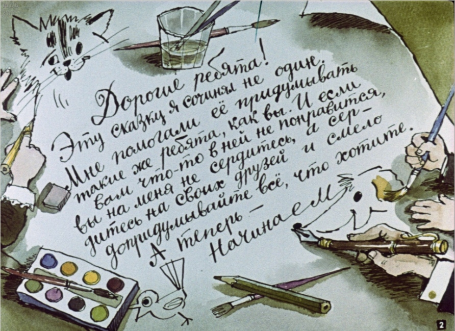 НО. Диафильм явно представляет собой краткую версию повести, это видно по тексту. Значит, в 1972г. повесть уже была готова. Скорее всего, сюжет уже был там. Зная, сколько времени требуется на создание повести, вероятность того, что сюжет был позаимствован из мультфильма 1971г., остается, но весьма небольшая.