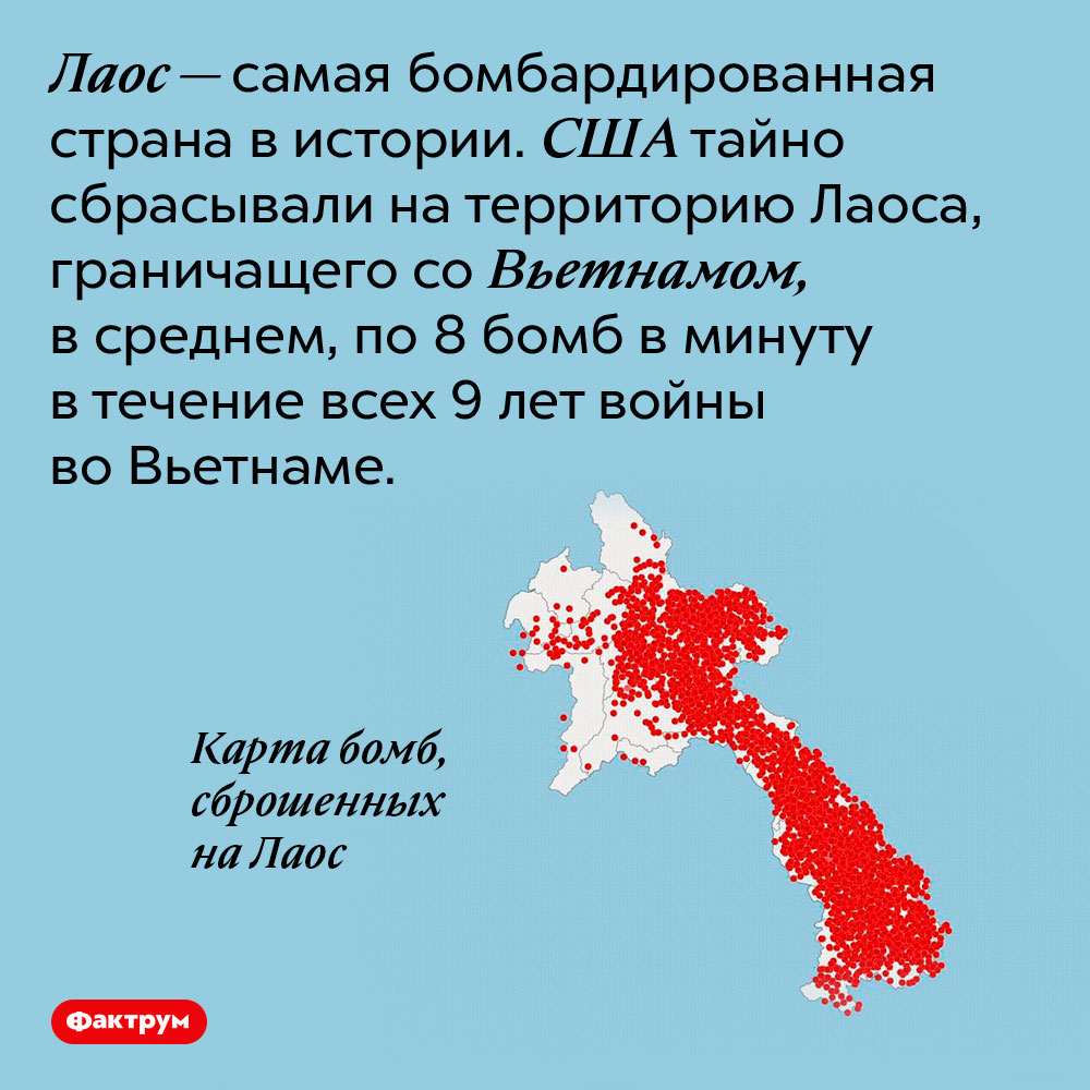 Лаос — самая бомбардированная страна в истории. США тайно сбрасывали на территорию Лаоса, граничащего со Вьетнамом, в среднем, по 8 бомб в минуту в течение всех 9 лет войны во Вьетнаме.